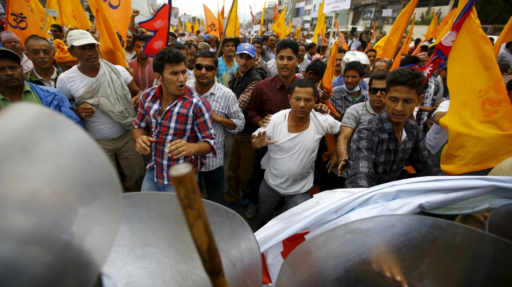 Hindu activists protesting in support of restoring the Hindu monarchy in Nepal, which was defeated by the Constituent Assembly by more than two-thirds of law-makers in September 2015.
