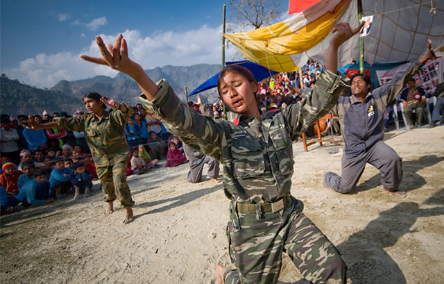 A cultural troupe made up of guerrillas of the People’s Liberation Army perform a program for the rural masses at the commencement of the people’s war in Rolpa, 1996.