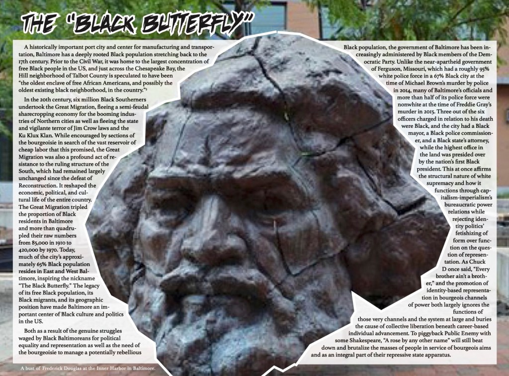 In the summer of 2018, a mixture of communists and those interested in walking the revolutionary road traveled from a handful of cities across North America to meet in downtown Baltimore, Maryland for an intensive three-day social investigation into the concrete conditions of the Black proletarian masses of West Baltimore in the aftermath of the 2015 rebellion. The rebellion—a culmination of festering frustration and rage due to the dispossession that accompanies deindustrialization,1 explicit and implicit racism, the occupation of residential areas by police known for their brutality and corruption,2 a rampant drug economy, and regular violence—was sparked by the murder of 25-year-old Freddie Gray by members of the Baltimore Police Department (BPD).