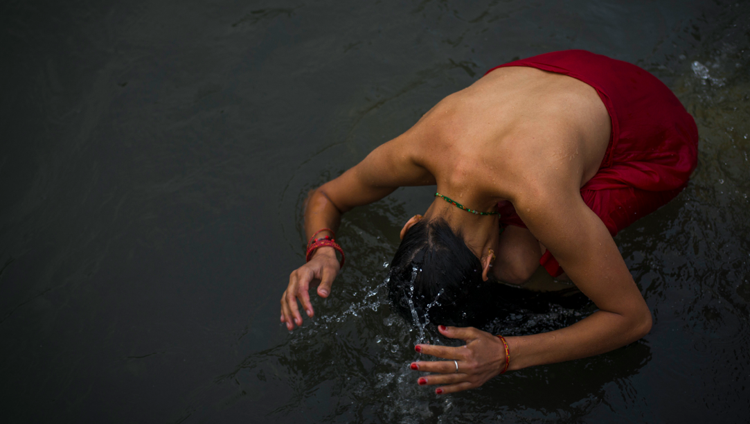 On the river’s edge by the Pashupatinath Temple, women observing Rishi Panchami spend hours in a process of ritual washing to cleanse themselves of the sins they are believed to have committed during menstruation. Photo by Poulomi Basu, 2013, Kathmandu.