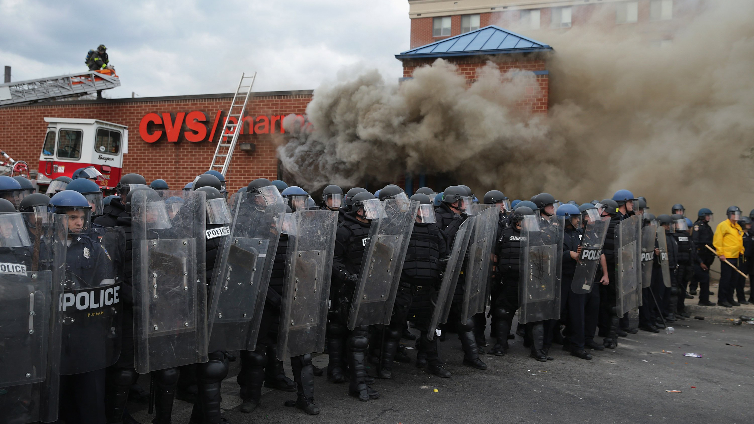 BALTIMORE, MD – APRIL 27: Baltimore Police form a parimeter around a CVS pharmacy that was looted and burned near the corner of Pennsylvania and North avenues during violent protests following the funeral of Freddie Gray April 27, 2015 in Baltimore, Maryland. Gray, 25, who was arrested for possessing a switch blade knife April 12 outside the Gilmor Homes housing project on Baltimore’s west side. According to his attorney, Gray died a week later in the hospital from a severe spinal cord injury he received while in police custody. (Photo by Chip Somodevilla/Getty Images)